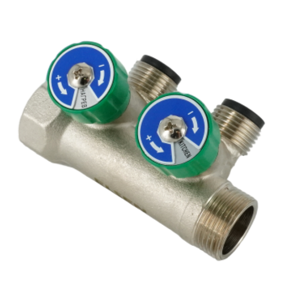 Колпачки оснащены маркерами с указанием приборов-потребителей, а также синекрасными метками для указания холодной или горячей воды. Модульный коллектор рассчитан на работу при максимальном давлении 1МПа/10 бар и температуре теплоносителя до 70 °С. Подключение к контуру потребителя осуществляется через резьбу 3/4’’ наружная резьба под плоское уплотнение. Коллектор поставляется в конфигурации на 2 и 3 отвода.