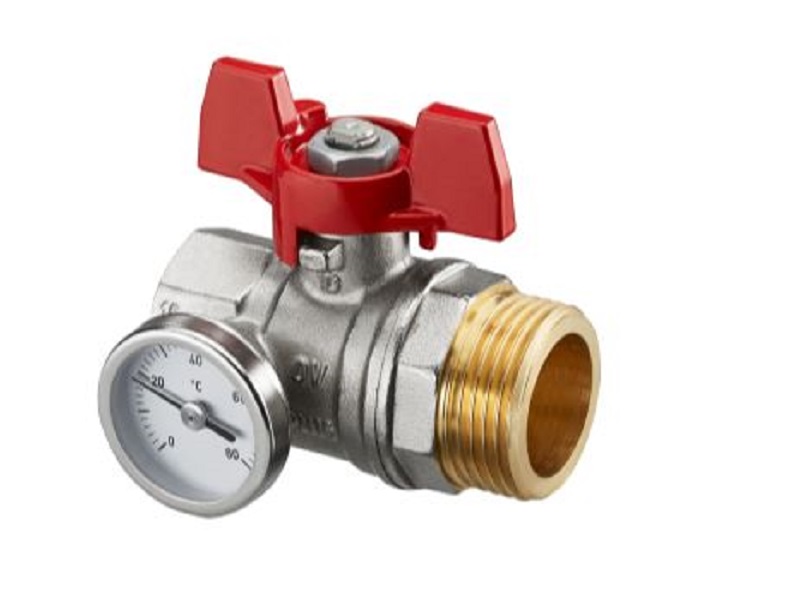 Шаровой кран с плоским уплотнением Ду25, G1BP x G1HP, с термометром (0–80 °C), с красной рукояткой