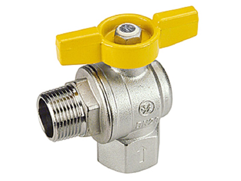 Угловой полнопроходной шаровой кран 3/4", В-Н, с желтой рукояткой бабочка, никелированный