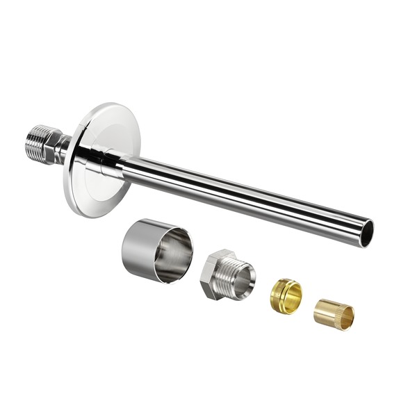 Комплект для настенного монтажа, Ду 15, 1/2", хромированный . Состоит из : отрезка хромированной трубы диаметром 15 мм, длиной 150 мм, присоединительного элемента с наружной резьбой 1/2" и присоединительного набора со стяжным кольцом