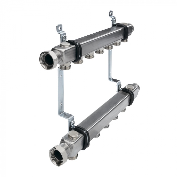 Коллектор для сист. отопл. без вентилей в сборе, 1" х 3/4"Ек, нерж. сталь, квадр. сечение, 11 к