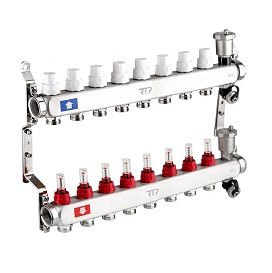 Коллекторная группа RTP с регулирующими клапанами, расходомерами, воздухоотводчиками, обратными и дренажными клапанами, кронштейном (евроконус 3/4") нержавеющая сталь SUS 304 1"х 8 выходов